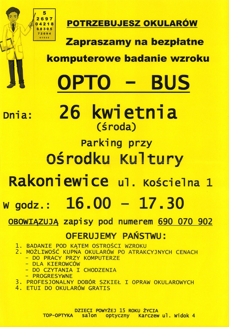 Bezpłatne komputerowe badanie wzroku Załączniki Potrzebujesz okularów [895.06 kB] Bez tytułu [1.33 MB] Drukuj Kopiuj link Facebook.com X.com Data publikacji: 30.03.2023 godz. 10:10 Wyświetlono: 145 Kategoria: Aktualności Zobacz również Zobacz więcej 16.03.2023 Aktualności Już 7 Maja, I Wiosenny Zlot Turystyczny 17.03.2023 Aktualności Podaj Dalej, czyli Pchli Targ w Rakoniewicach 27.03.2023 Aktualności Tercet czyli Kwartet 26.03.2023r. W dniu 26.03 odbył się koncert Tercet czyli Kwartet w składzie Hanna Śleszyńska, Piotr Gąsowski, Robert Rozmus. Było to świetne wydarzenie ze wspaniałą atmosferą ! Koncert uważamy za udany i cieszymy się,...