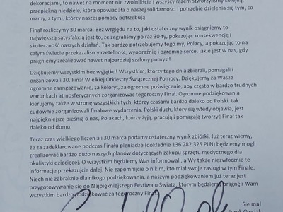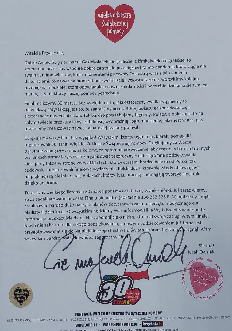 01.03.2022 Aktualności Mamy dla Was wiadomość od Jurka, prosto z Fundacji... Mamy dla Was wiadomość od Jurka, prosto z Fundacji WOŚP! Drodzy Przyjaciele, Zewsząd otrzymujemy informację, że angażujecie się w różne formy pomocy dla Ukrainy. Bardzo, bardzo za to dziękujemy...