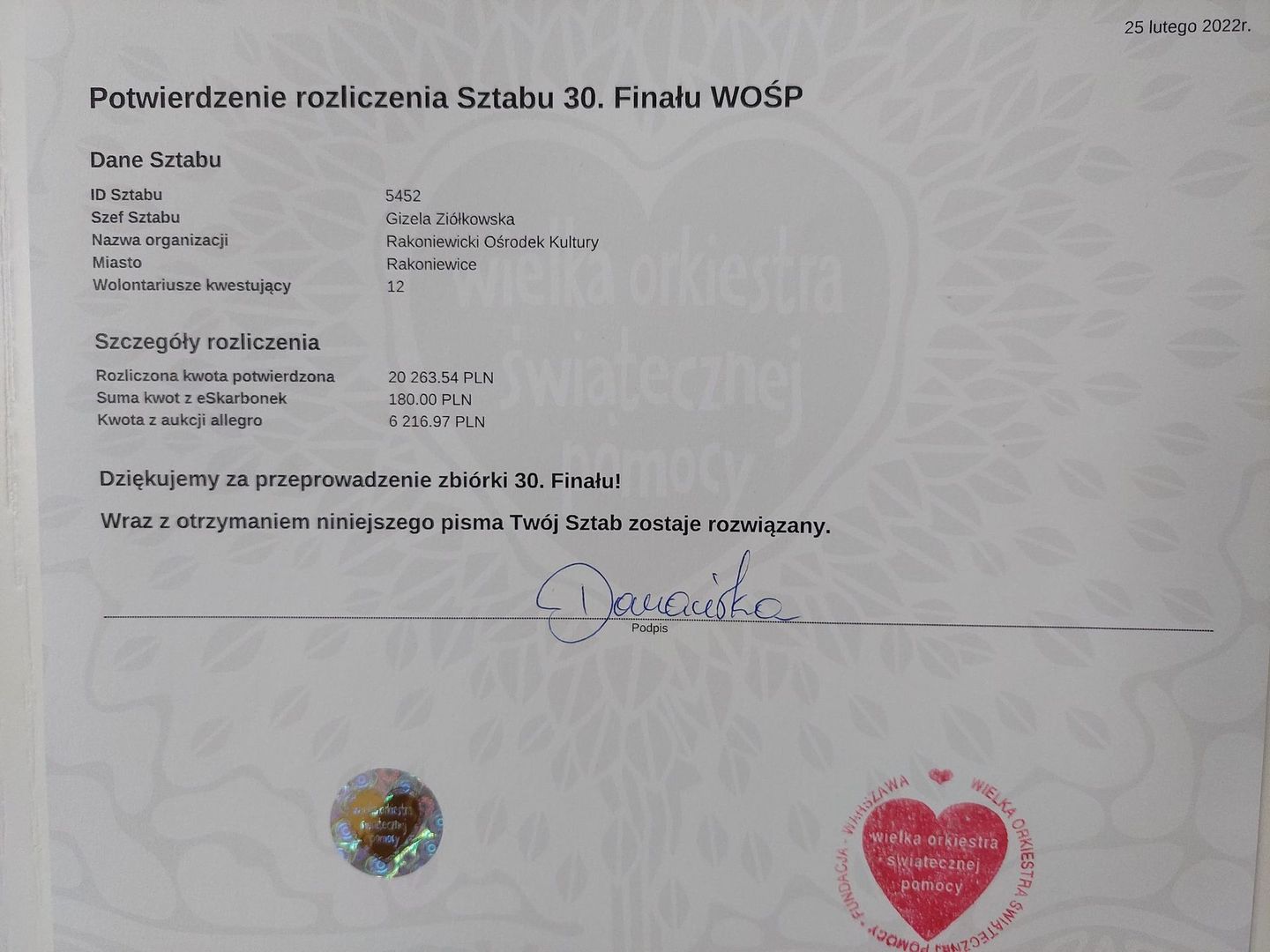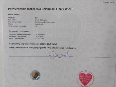 Oficjalne Rozliczenie Finału WOŚP! Oficjalne Rozliczenie Finału WOŚP! Właśnie dotarło do nas oficjalne rozliczenie sztabu #5452! Zebraliśmy 26.660,51 zł. Zobaczcie sami! Dziękujemy Wam z całego serca! Galeria zdjęć Załączniki Oficjalne Rozliczenie Finału WOŚP! [294.31 kB] Drukuj Kopiuj link Facebook.com X.com Data publikacji: 01.03.2022 godz. 12:56 Wyświetlono: 175 Kategoria: Aktualności Zobacz również Zobacz więcej 01.03.2022 Aktualności Narodowy Dzień Pamięci Żołnierzy Wyklętych 01.03.2022 Aktualności Mamy dla Was wiadomość od Jurka, prosto z Fundacji... Mamy dla Was wiadomość od Jurka, prosto z Fundacji WOŚP! Drodzy Przyjaciele, Zewsząd otrzymujemy informację, że angażujecie się w różne formy pomocy dla Ukrainy. Bardzo, bardzo za to dziękujemy... 01.03.2022 Aktualności Ostatki Ostatki! Już dziś ostatni dzień karnawału!