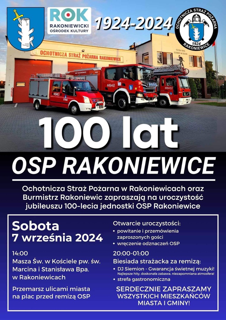 Zapraszamy wszystkich mieszkańców miasta i gminy Rakoniewic na wspólne celebrowanie 100-lecia Ochotniczej Straży Pożarnej Rakoniewice. Uroczystość zacznie się Mszą Świętą w kościele w Rakoniewicach a następnie ulicami miasta ruszy korowód, który zaprowadzi wszystkich pod remizę OSP. Zobaczymy uroczyste otwarcie oraz przemówienia zaproszonych gości a także wręczenie odznaczeń dla członków jednostki. Wieczorem zapraszamy na wspólną biesiadę.